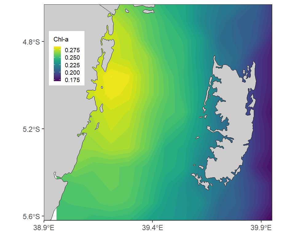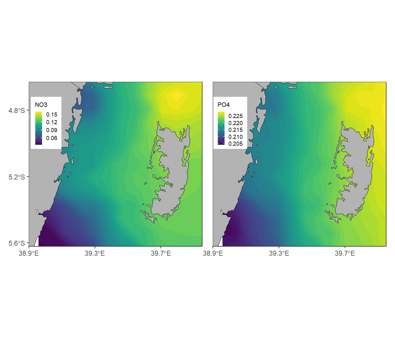 We will use Pemba dataset of December 2024, extracted using geodata package (Hijmans et al., 2024). The dataset consists of six variables: Longitude, Latitude, Chlorophyll, Nitrate, Phosphate and Iron.