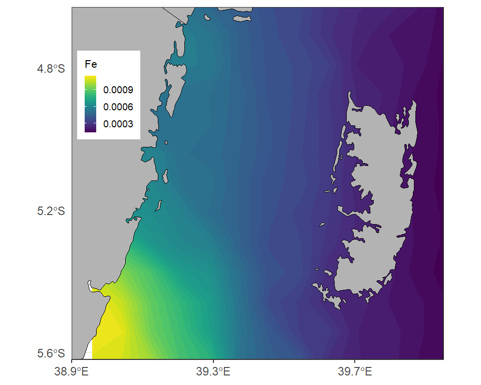 Further investigations was done by assessing the level of Iron in an area. The results indicated lower Iron levels in the Northern and Eastern side of the Island than in the channel Figure 4. The Northern and Eastern areas side of the Island which had higher nitrate and phosphate levels with low chl-a concentration observed to have low Iron levels than areas around the channel.